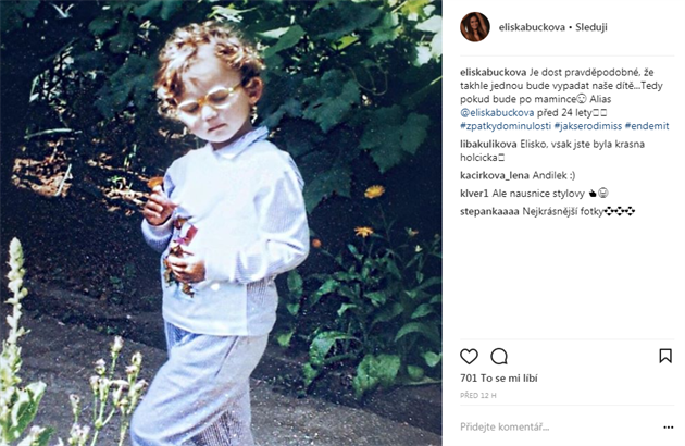 Eliška sdílela v pátek večer na Instagram svou 24 let starou fotografii, na které jí jsou pouhé 4 roky. K té napsala: „Je dost pravděpodobné, že takhle jednou bude vypadat naše dítě. Tedy pokud bude po mamince.“