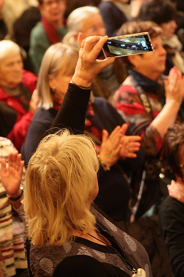Jakmile poslední rozloučení skončilo a všichni v sále ve stoje tleskali, blondýnka neváhala a potlesk si opět natáčela. Nadšené turistce nesmělo uniknout ani vynášení rakve.