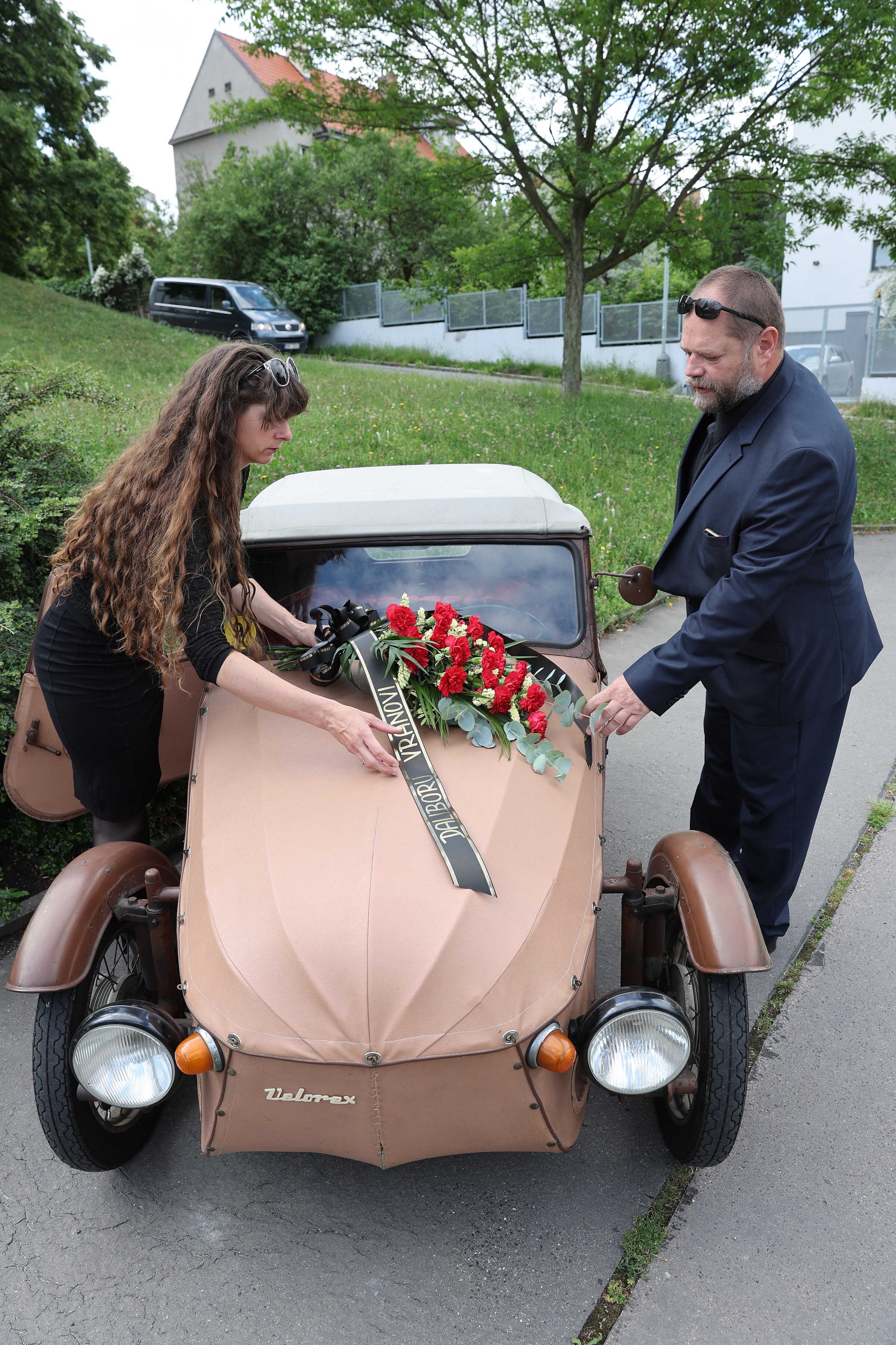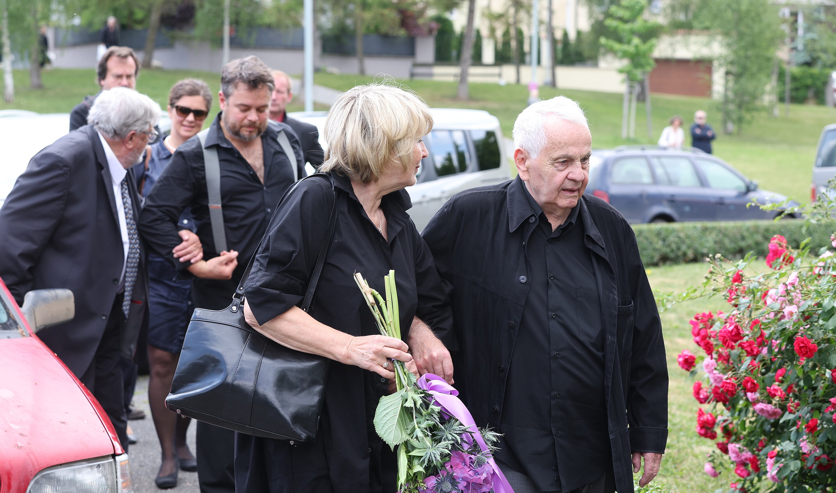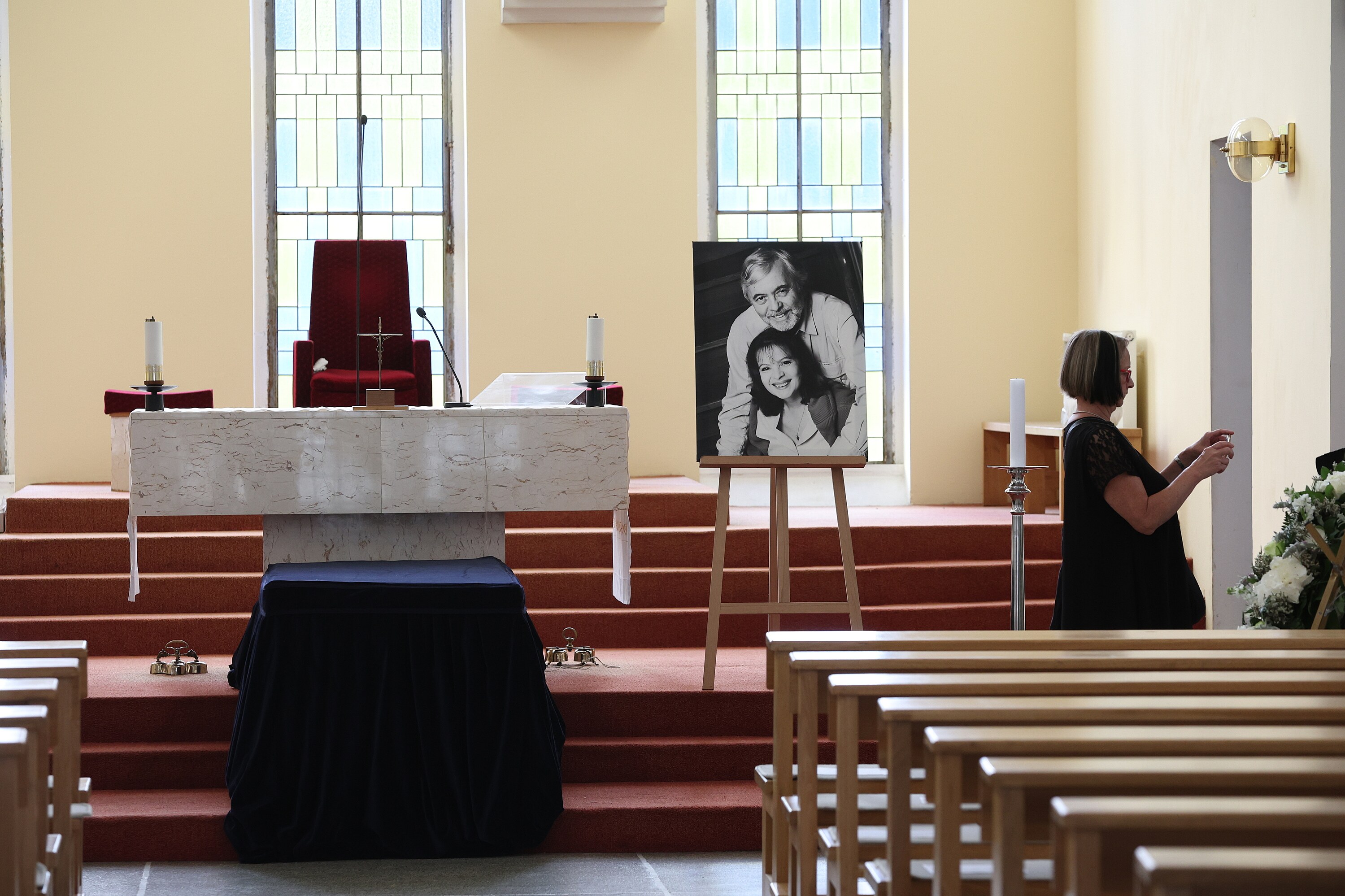 Že se chystá poslední rozloučení s velikánem českého filmu, bylo v okolí kostela znát už od ranních hodin. Zaměstnanci pohřební služby tam nosí věnce, uvnitř síně už je připraven zmíněný portrét s Libuškou.