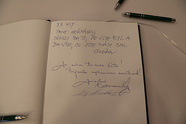 První dva jmenovaní přišli společně. A společně také do kondolenční knihy napsali vzkaz, že je jim odchod Karla Heřmánka moc líto. Pod něj pak připojili svoje podpisy.