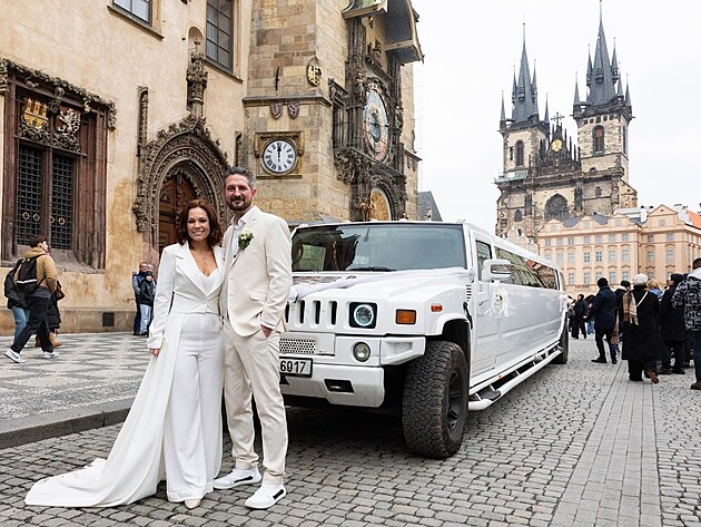 Novomanžele přivezla přímo na Staromák obří limuzína, Michaela Nosková na sobě měla krásný kostýmek s vlečkou, manžel Jan zase stylový béžový oblek. Pro turisty se tak na chvíli stali větší atrakcí než Orloj.