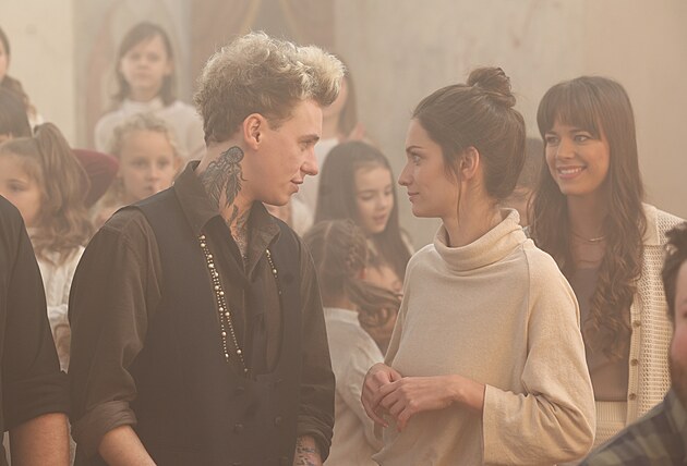 „Děkujeme. Ano, příběh je tak nějak ještě rozjetý, ale samozřejmě jsme kolegové, ale máme se rádi,“ uvedl zpěvák, který během natáčení krásnou Veroniku několikrát držel za ruku.