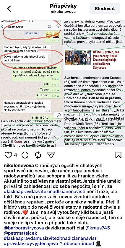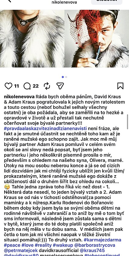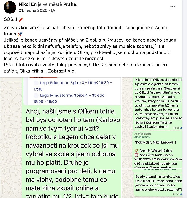 Sociální sítě Nikol Enevové v posledních letech fungují jako veřejný deník sporu, který se z opatrovnických tahanic postupně přelévá až do roviny trestního řízení. V jednotlivých statusech se opakují stejné motivy. Oliver, střídavá péče, předávání, blokace kontaktu, frustrace ze soudů a OSPOD, a zároveň pořád ostřejší popis toho, kdo podle ní v zákulisí tahá za nitky. Nejde jen o výpady proti Adamovi Krausovi. Enevová často rozšiřuje konflikt na širší okruh lidí z jeho rodiny a okolí a tím z toho dělá příběh nerovného boje, ona jako matka proti známému jménu a proti systému, který podle ní nefunguje.