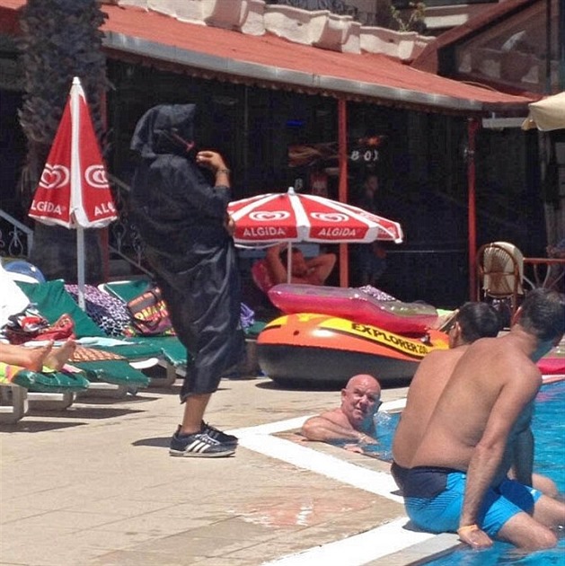 Muž měl na sobě černý hábit a šátek ovázaný kolem hlavy tak, aby zakrýval obličej. Začal křičet v arabštině a předstíral, že na šestiletou holčičku, která si hrála v brouzdališti, vytahuje zbraň.