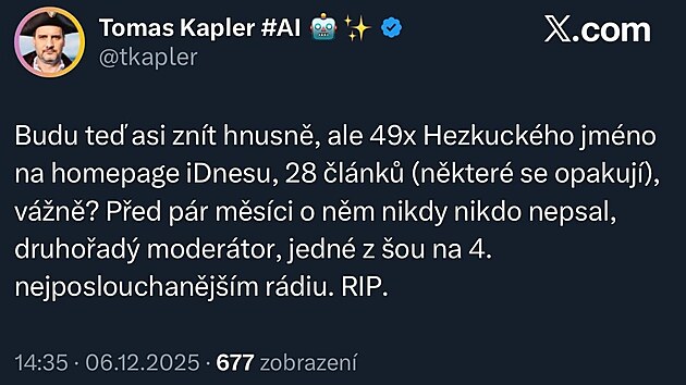 „Budu teď asi znít hnusně, ale 49krát Hezuckého jméno na homepage iDnesu, 28 článků (některé se opakují), vážně? Před pár měsíci o něm nikdy nikdo nepsal, druhořadý moderátor jedné z šou na čtvrtém nejposlouchanějším rádiu. RIP,“ vzkázal Kapler na sociální síti X.