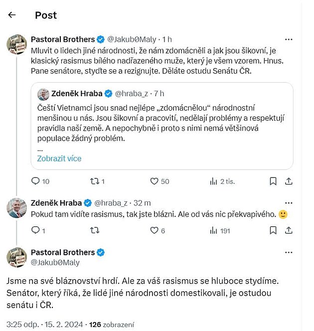 „Mluvit o lidech jiné národnosti, že nám zdomácněli a jak jsou šikovní, je klasický rasismus bílého nadřazeného muže, který je všem vzorem. Hnus. Pane senátore, styďte se a rezignujte. Děláte ostudu Senátu ČR,“ vzkázali faráři směrem k Hrabovi.